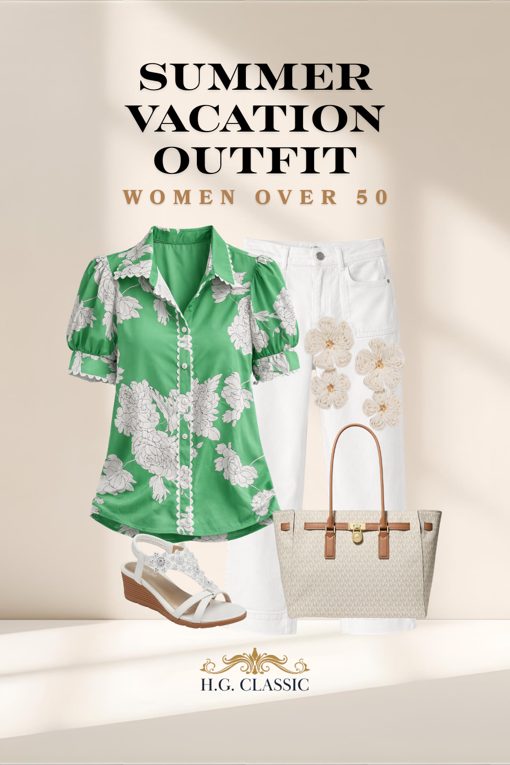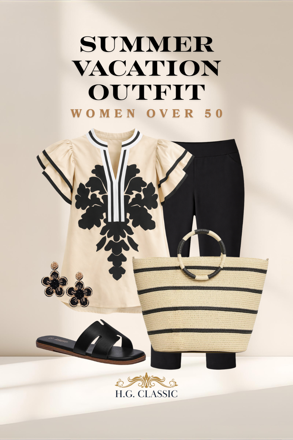 Remember to use the principles we’ve discussed before, such as accurate sizing using the size chart and aiming for clothes that skim the body rather than cling. If needed, utilize the partial shirt tuck to create a waistline. I’ve chosen fairly streamlined, non-bulky sandal options to keep you light on your feet.